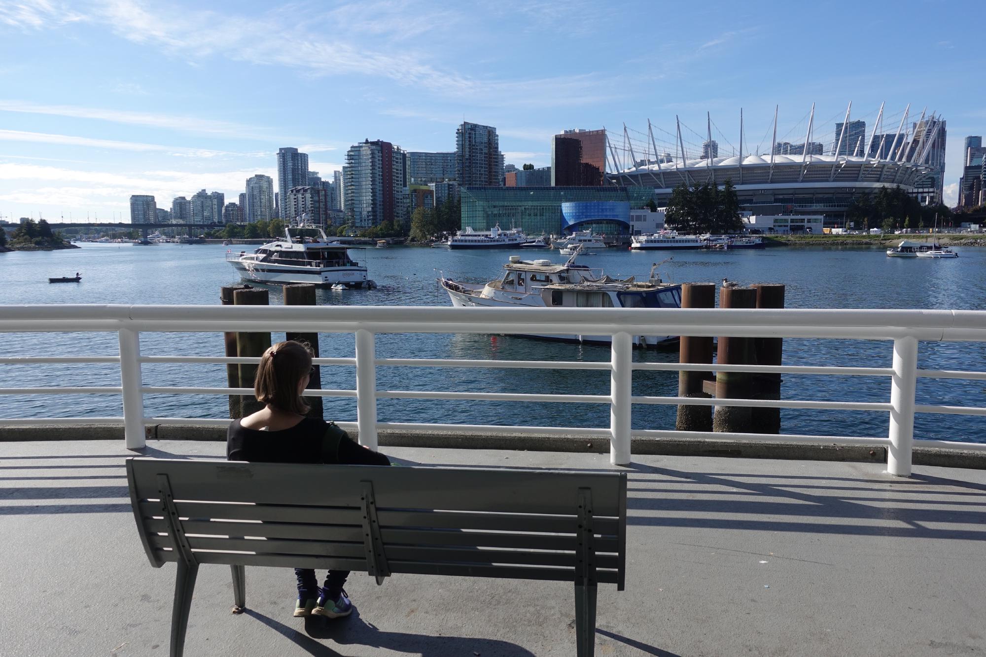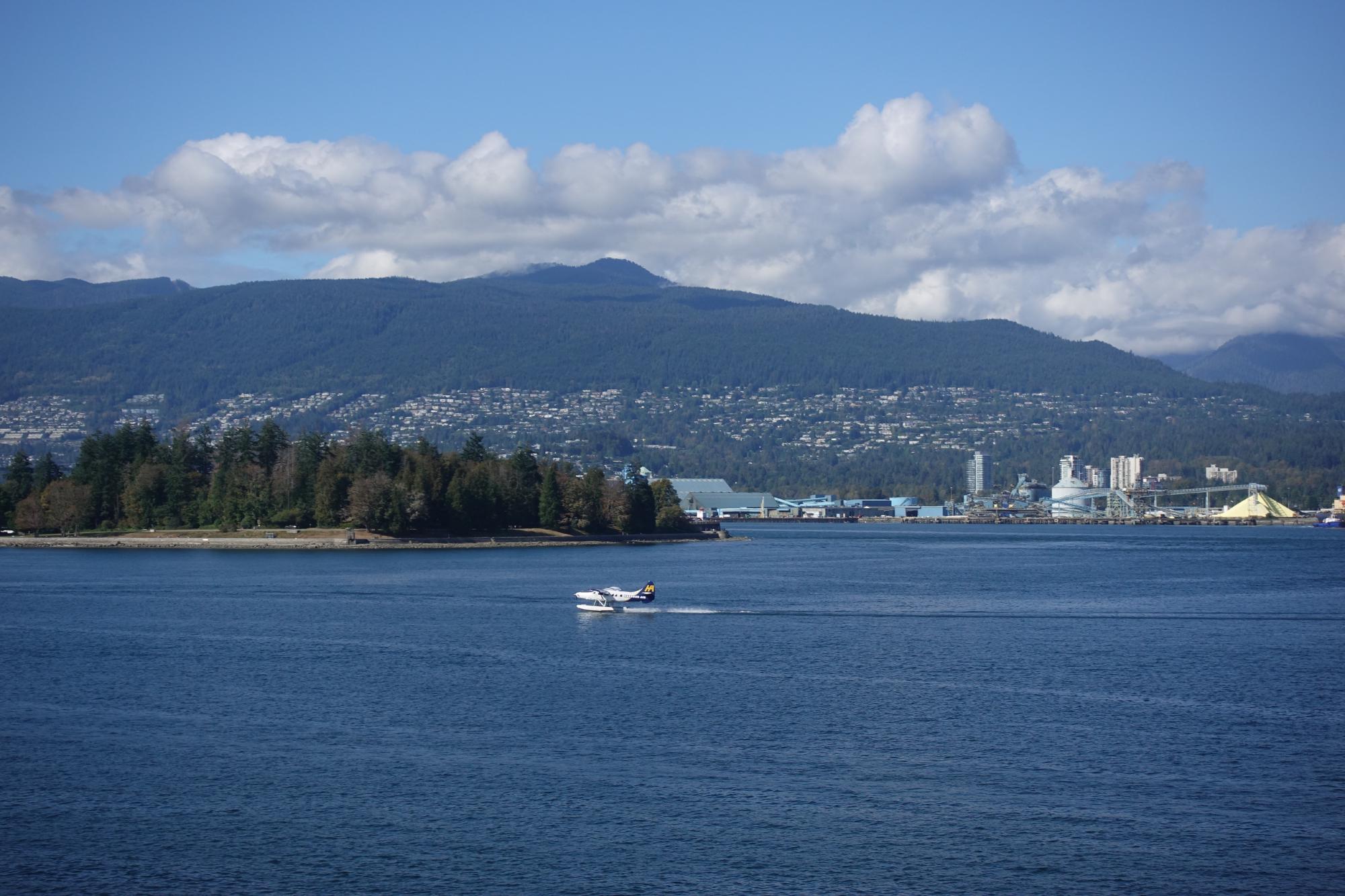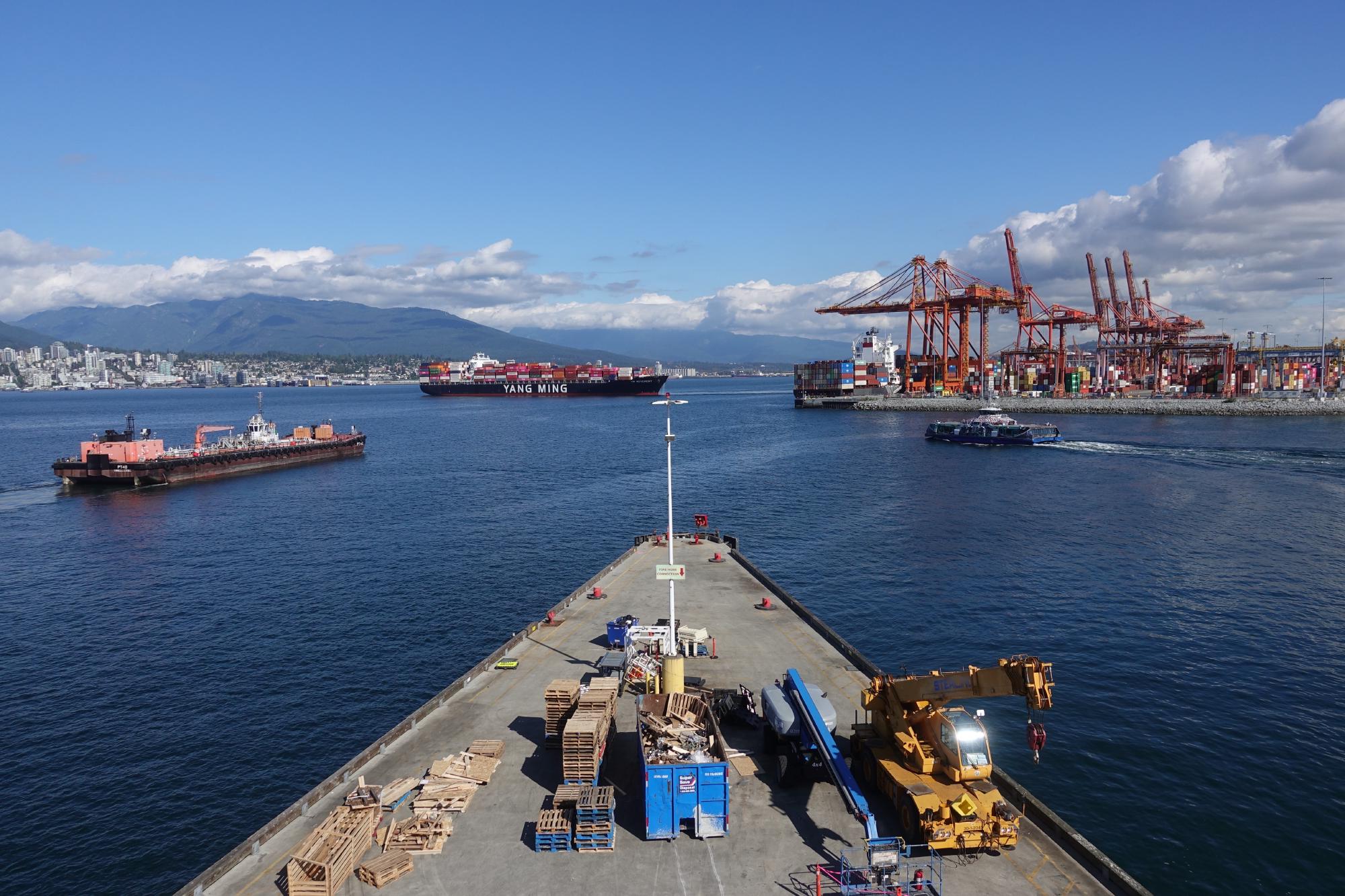 Wieder draussen bestaunen wir vom Canada Place aus die Fähren, die Kreuzfahrtschiffe und den Containerhafen.