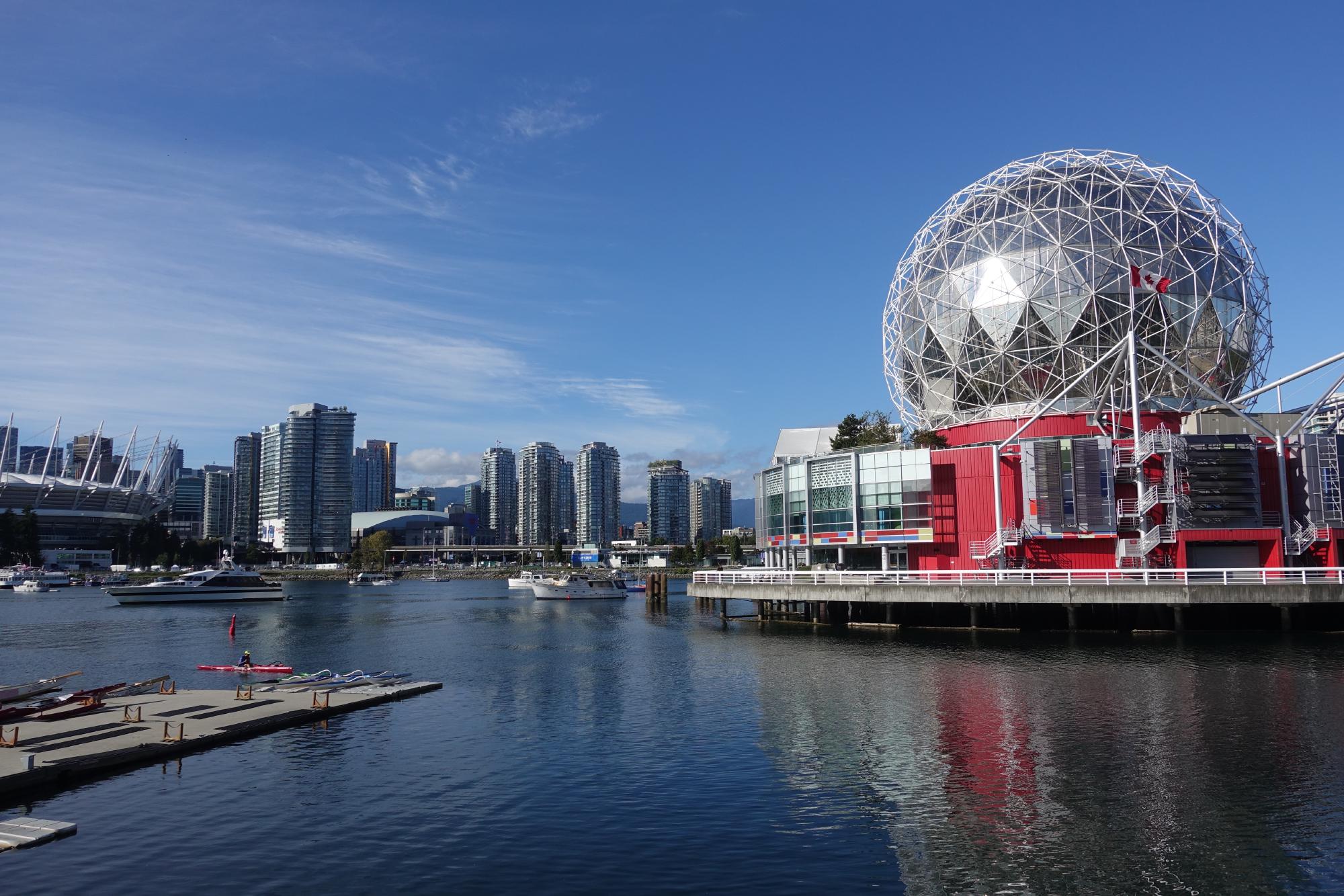 Dann folgt ein schöner Spaziergang im Creekside Park um das kugelige Science World herum.