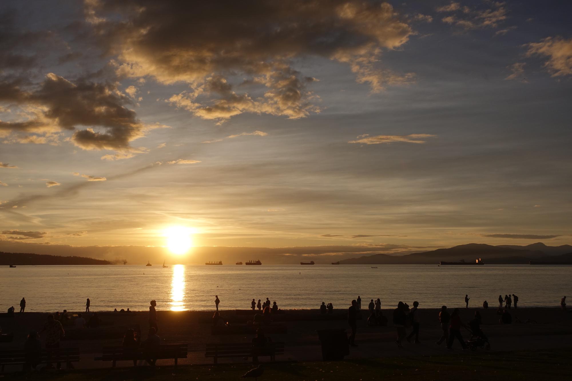 Danach fahren wir für den Sonnenuntergang an die English Bay und geniessen dort feine Zweifel-Chips auf einem Bänkli (Danke Chantal & Luca!), während uns unser irischer Bäklinachbar mit indischem Akzent ungefragt über alle Ausflugstips in Vancouver vollquatscht. Freundlich, die Leute hier!