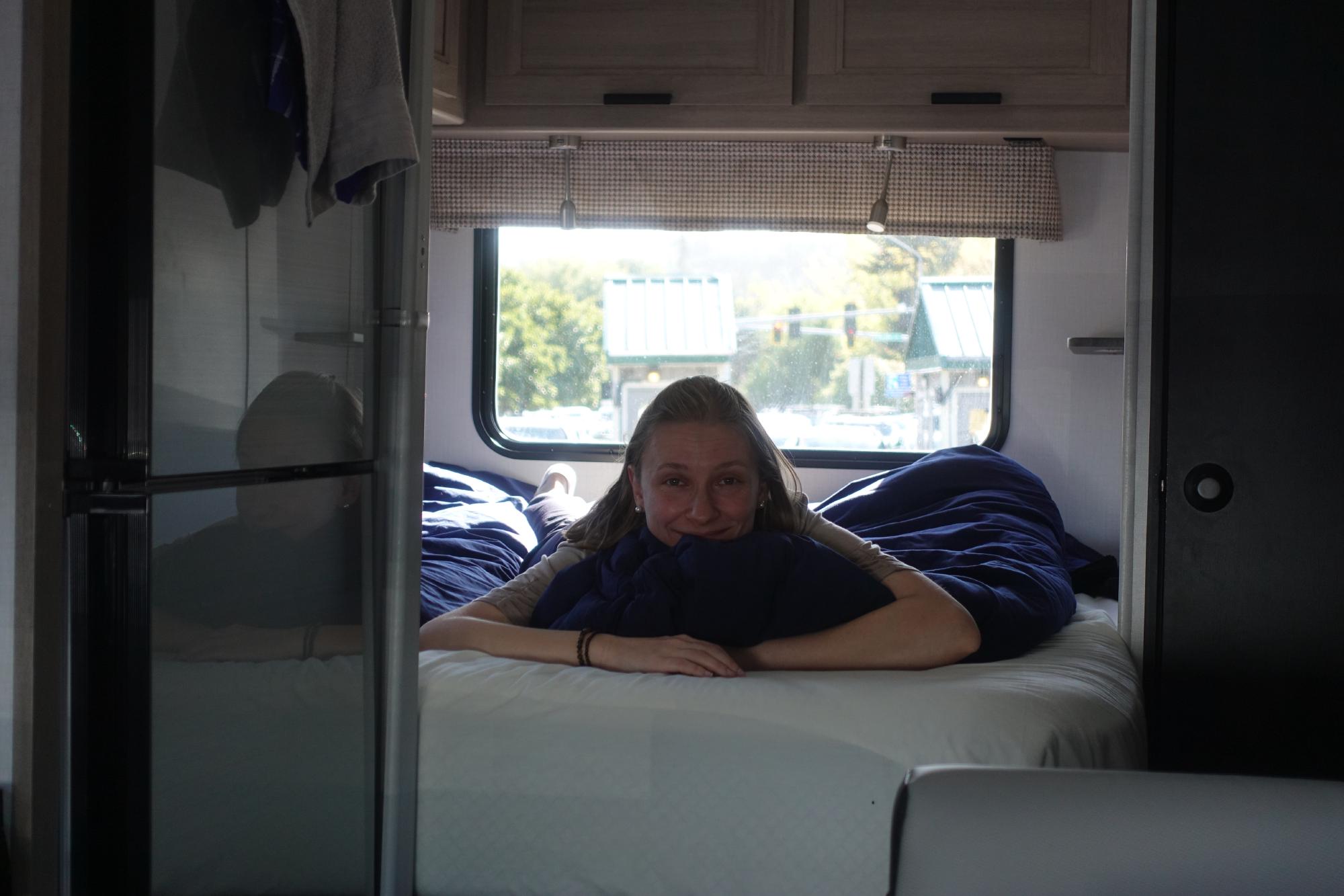 Schliesslich schalten wir Musik ein und kämpfen uns aus dem weichen Bett. Bald schon ist die Morgensteifigkeit vergessen und wir haben wahnsinnig Freude, wie gut alles funtioniert. Eine heisse Dusche am Morgen, das Brot frisch aus dem Toaster und warme Gipfeli zum Frühstück! Gut, das war nicht ganz so einfach, denn unser Ofen ist eigentlich eine Mikrowelle. Nach ein paar Versuchen haben wir herausgefunden, dass die Grillfunktion am nächsten ans Backen herankommt :) Das alles dauert aber seine Zeit, und bis wir wieder reisefertig sind (man muss erst innen alles abwaschen und wieder flugsicher verräumen, Wasser ablassen, Wasser füllen, den Abfall entsorgen, den Camper kurz rausbeselen, das Slide-Out wieder reinfahren, und nicht vergessen alle unsere Aussenstauräume wieder gut tagsichern) wird es ca. 11:30 Uhr. Nicht so schlimm, da werden wir bestimmt noch schneller!