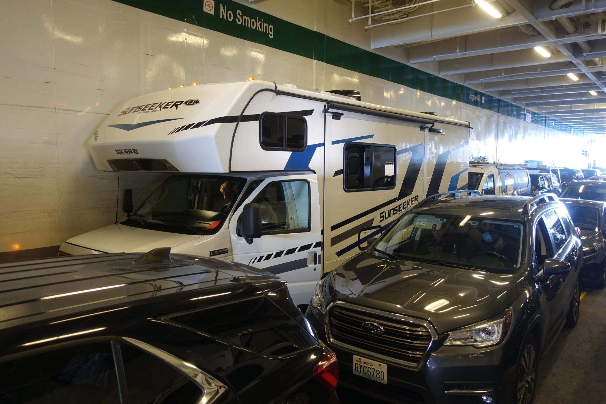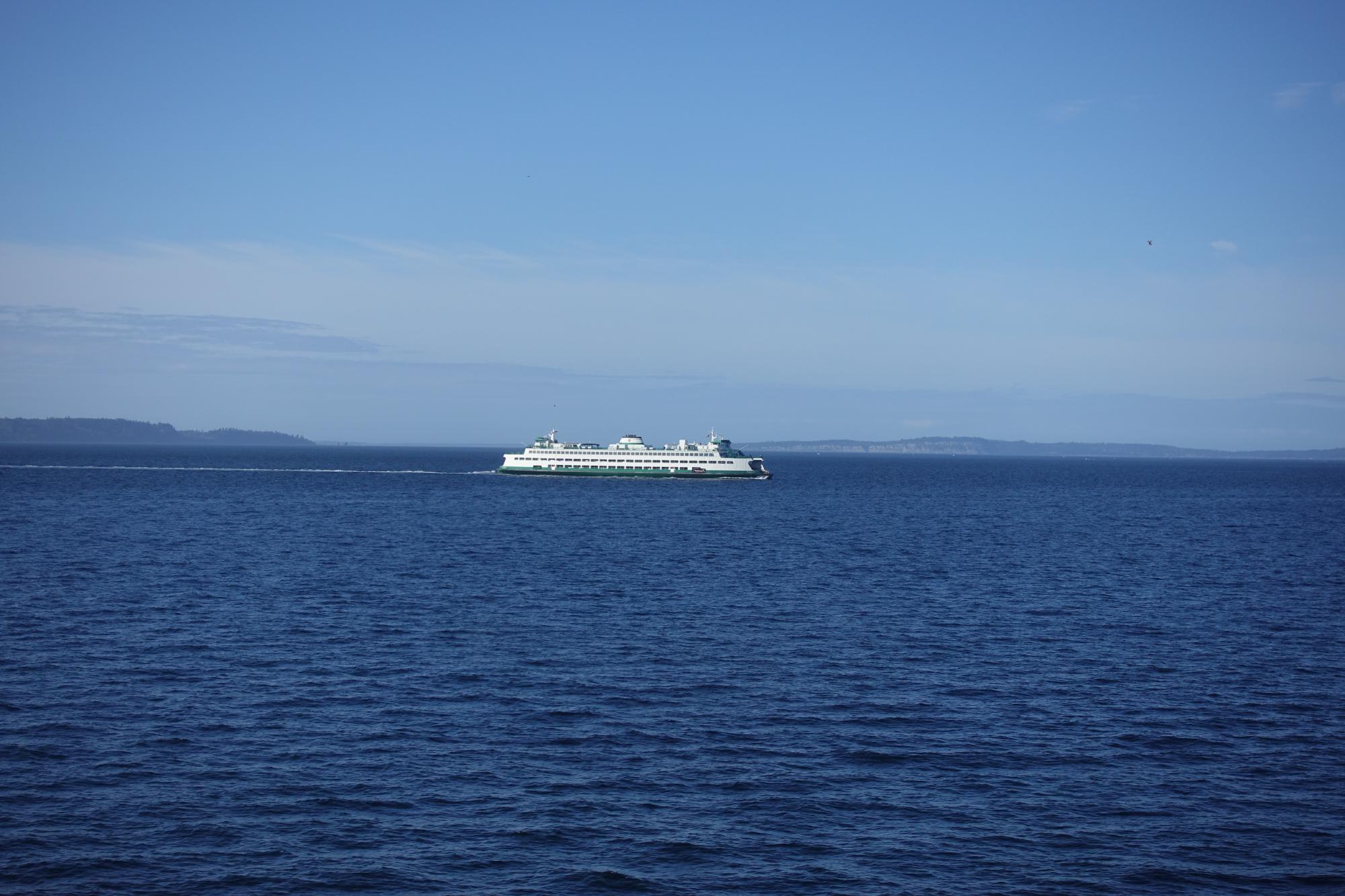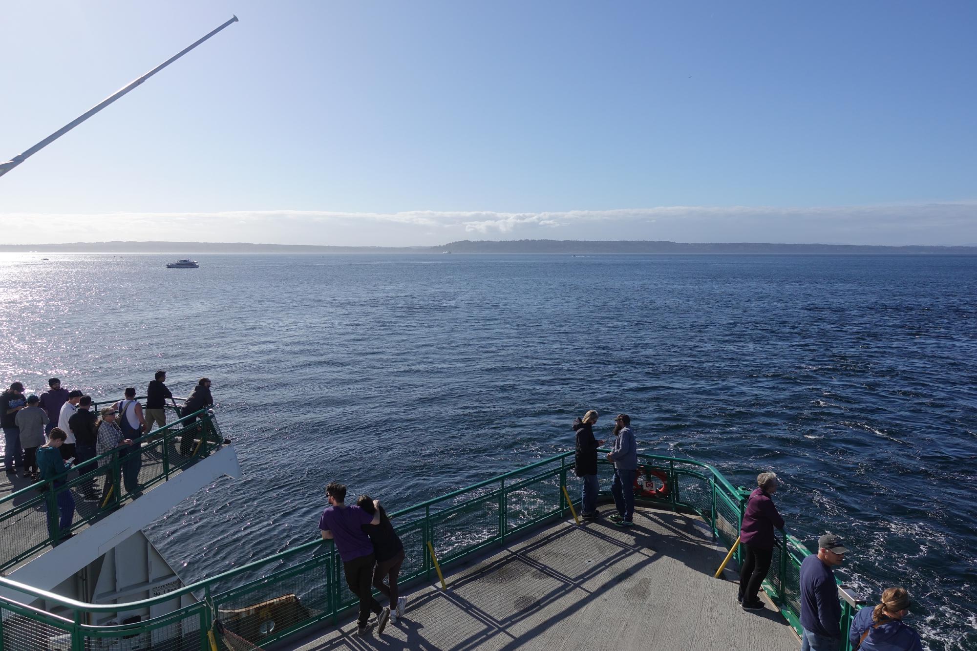 Inzwischen ist die Sonne herausgekommen und wir fahren zum Fährhafen von Edmonds, um dort in einer 20-minütigen Schifffahrt auf die Olympic-Halbinsel überzusetzen. Wir denken, wir sind schlau, und sparen uns so langes Fahren um all die Meeresarme herum. Es stellt sich aber heraus, dass wir nicht die einzigen mit dieser Idee sind an einem Freitagnachmittag, und so stehen wir laange in der Schlange, bis wir auf die Fähre auffahren können. Das Schlangestehen ist aber im Camper mega feudal. Man kann sich hinten auf dem Bett kurz hinlegen, den Kühlschrank aufmachen und Snacks hervornehmen oder sich einfach im Gang die Beine vertreten. Die anderen müssen nach draussen auf die Strasse dafür! Irgendwann beginnen wir noch mit einem Hörbuch und freuen uns daran, wie viele Möglichkeiten wir haben, das Warten zu überbrücken :)
