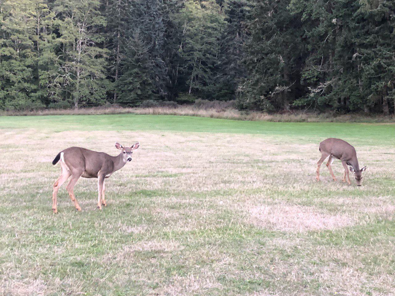 Es ist schon Abend und wir suchen uns einen Platz für die Nacht. Wir finden einen Campingplatz, der etwa 30 Dollar günstiger ist als der letzte, aber wir haben schon noch Luft nach oben (unten?), was die Kosten pro Nacht angeht. Dafür haben wir heute wieder Strom und Frischwasser, und aus dem Führerstand sehen wir direkt aufs Meer, während nebenann die wilden Hirsche weiden.