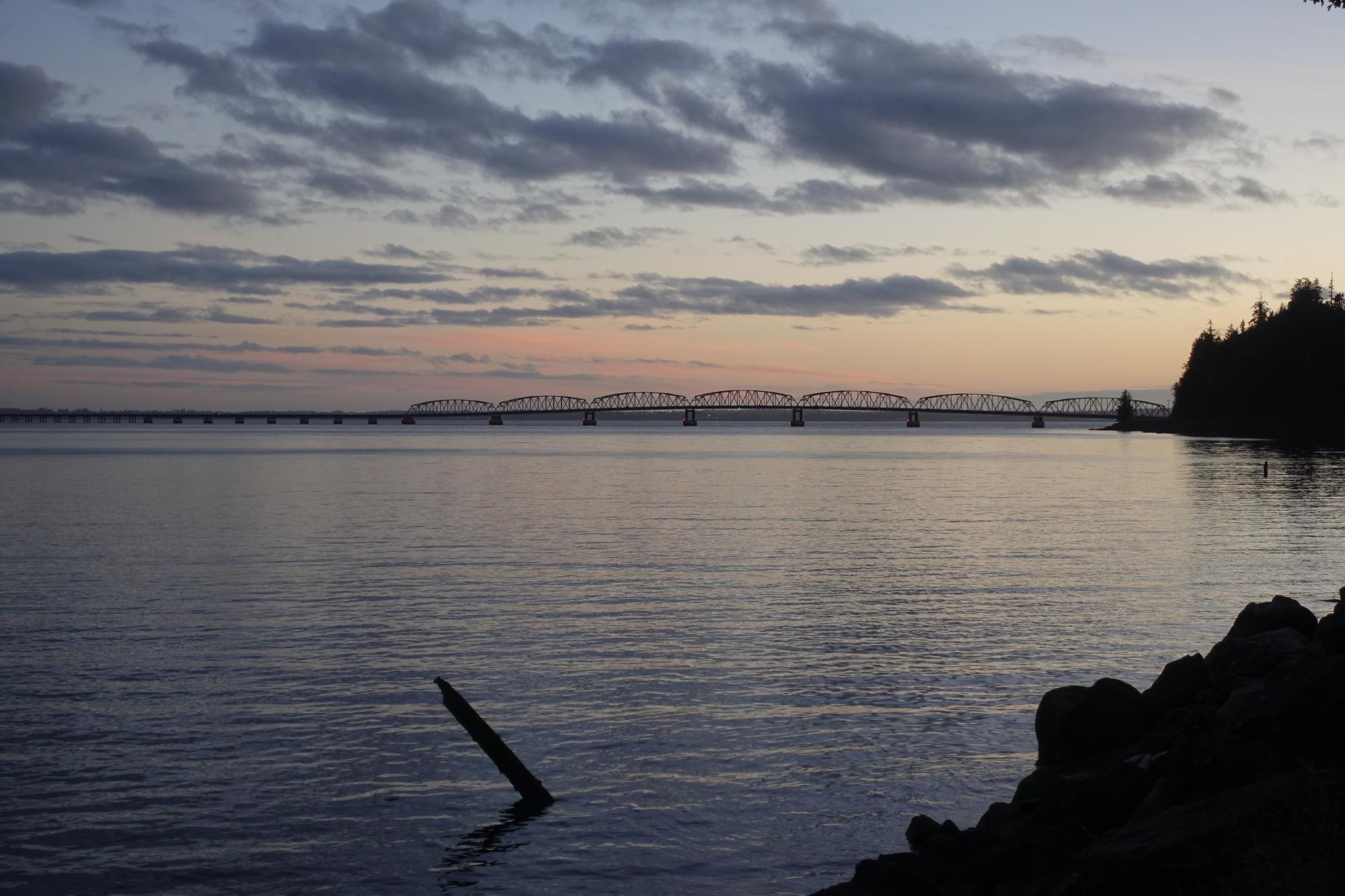 Unser Parkplatz liegt gleich bei der Astoria-Megler-Bridge. Diese führt uns dann morgen vom Bundesstaat Washington nach Oregon, wir kommen also langsam in den Süden. Und tatsächlich blies der Wind am Strand heute schon nicht mehr ganz so harsch, es wird langsam wärmer!