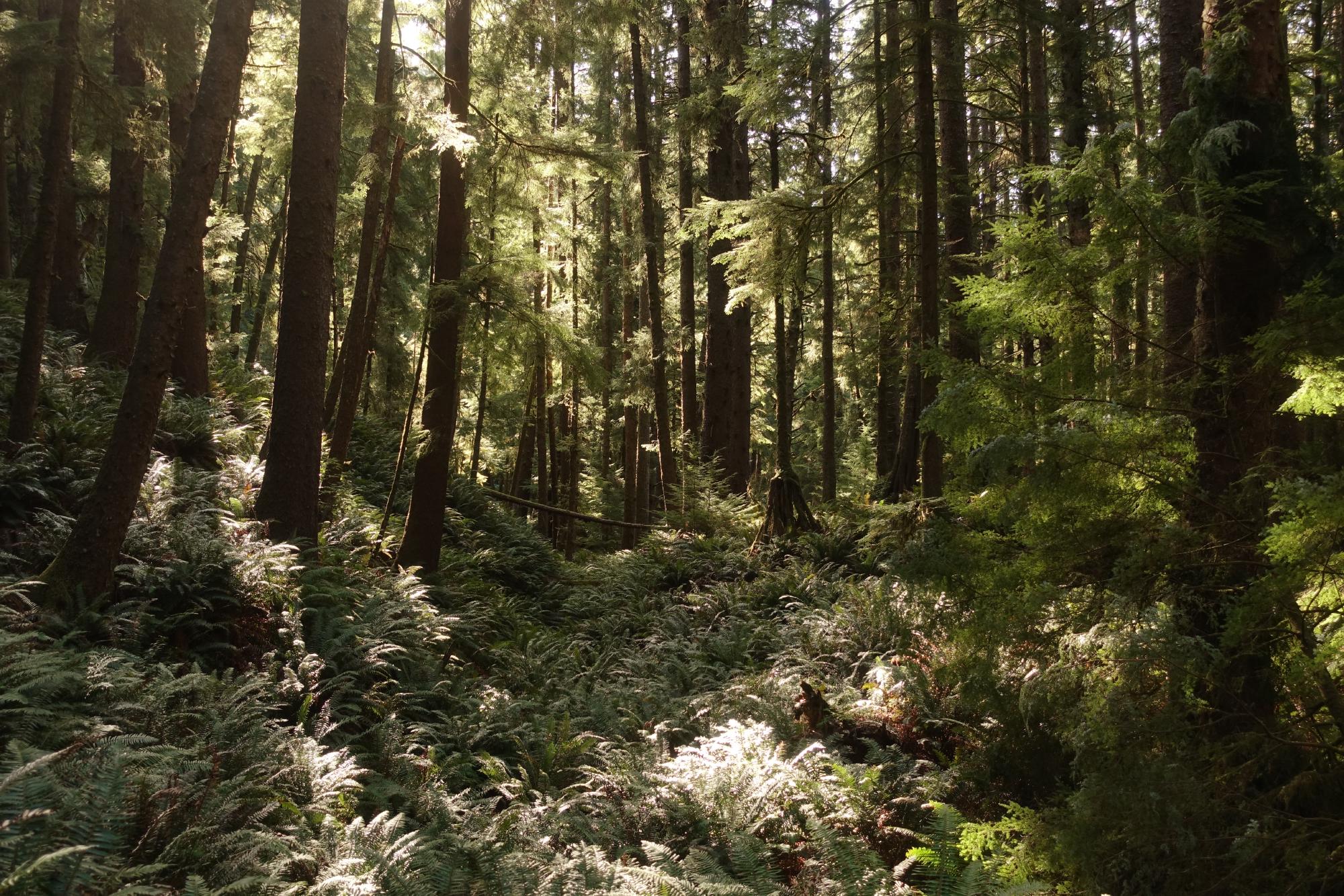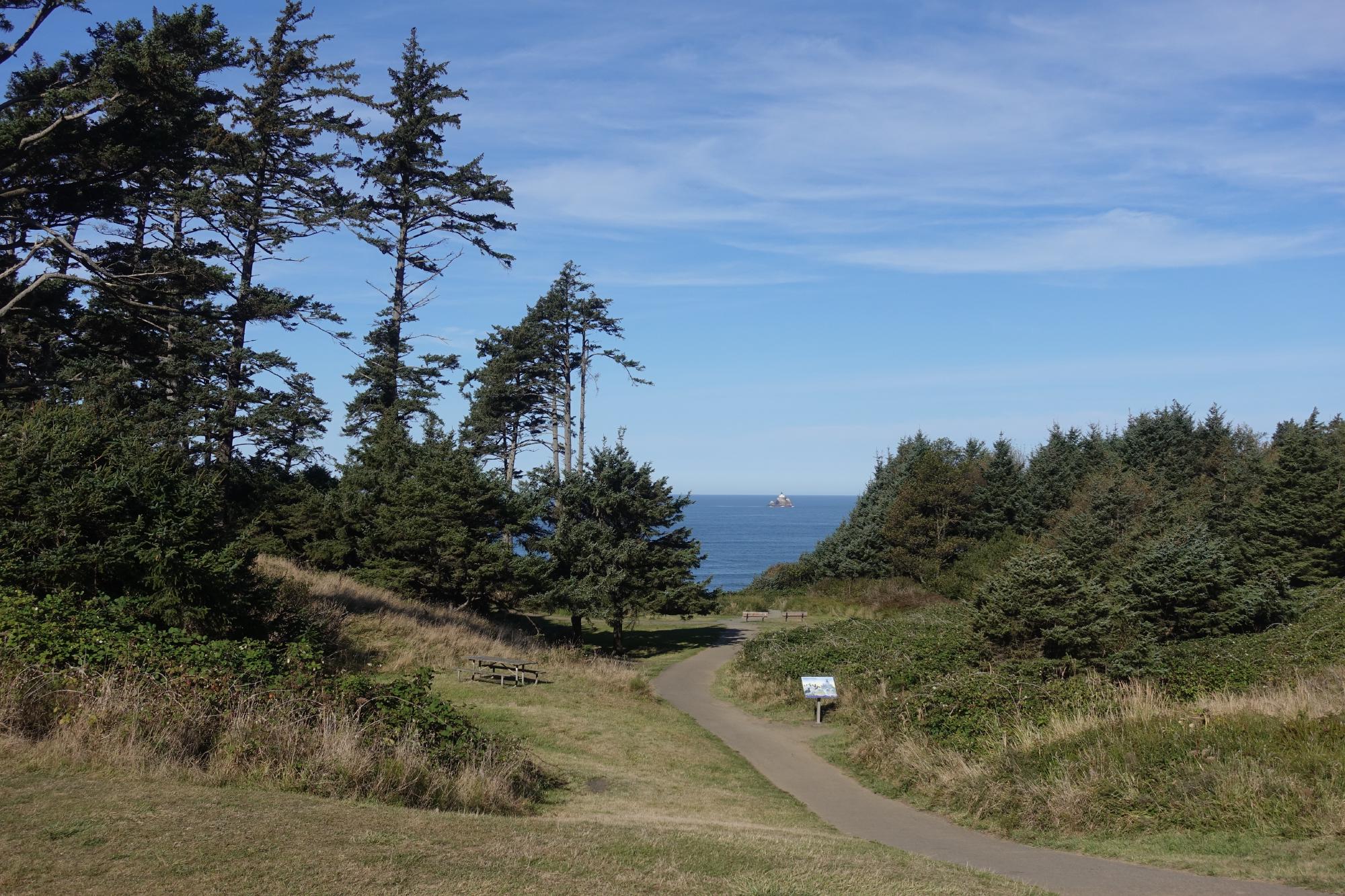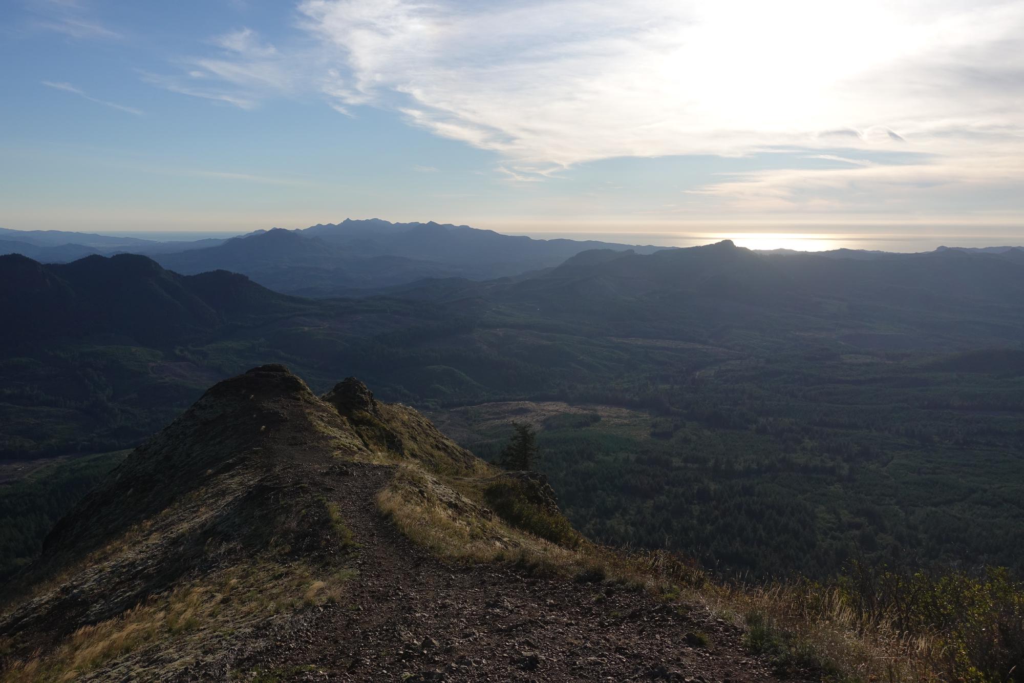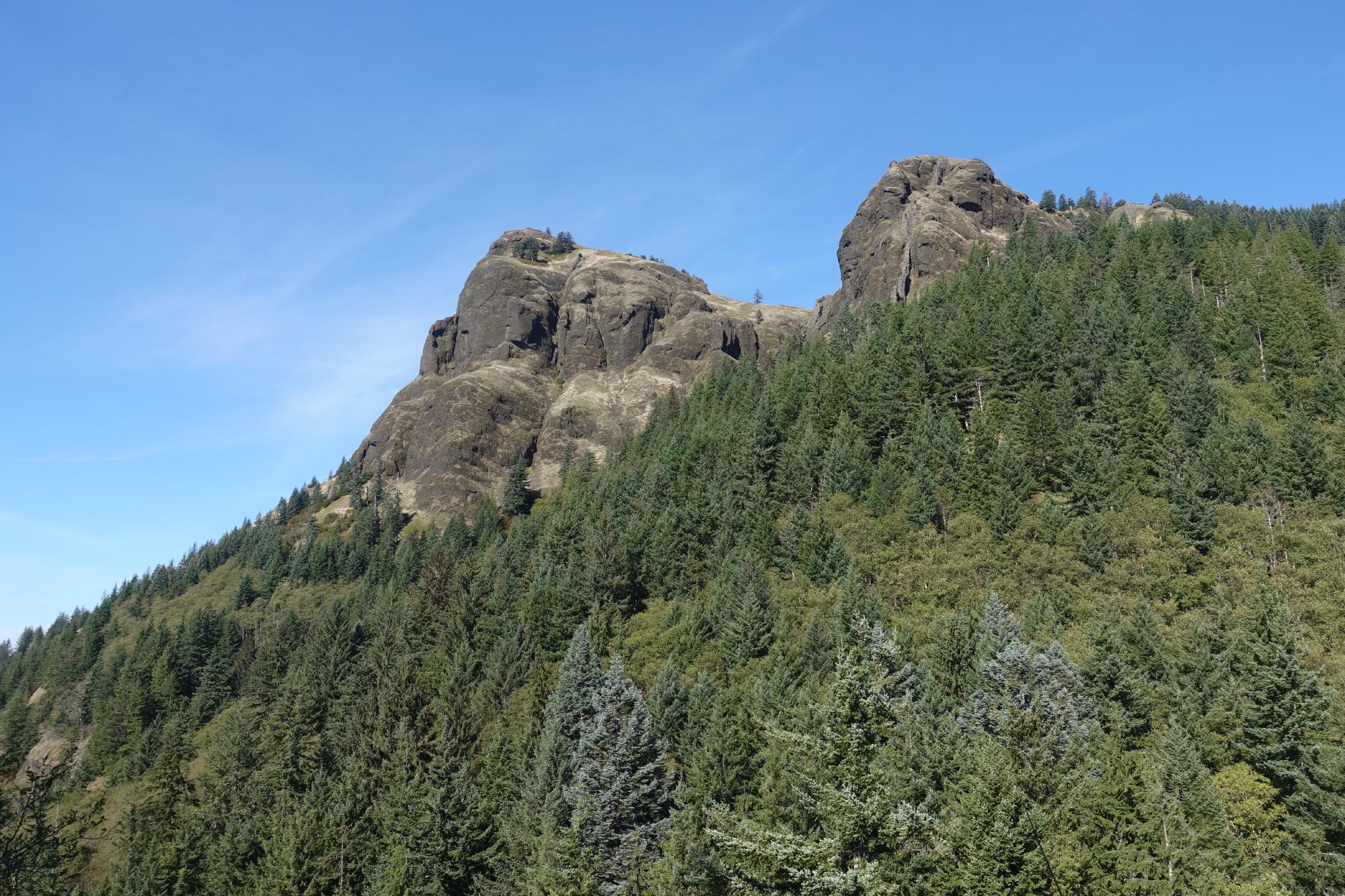 Und dann verabschieden wir uns vorerst vom Meer, ab jetzt geht unsere Reise landeinwärts, als erstes Richtung Portland. Aber es ist so ein wunderschöner Tag, es wäre schade, diesen nur mit Autofahren zu verbringen. Also nehmen wir bald den Abzweiger Richtung Saddle Mountain. Es geht sieben Meilen auf einer engen geteerten Strasse den Hügel hinauf. An einer Stelle kratzen wir wieder einmal mit dem Camper-Füdli am Boden, wie wir es bei diversen Parkplatzausfahrten schon gemacht haben. Das Gefährt ist einfach ein Stück zu lang, und so haben wir die “Sollkratzstelle” schon ein paar Mal ausprobiert. Dem Camper passiert weiter nichts, aber das Geräusch geht einem durch Mark und Bein. Simone wird es wind und weh, weil wir auf der gleichen Strasse auch wieder nach unten müssen (auf dem Rückweg wird sich herausstellen, dass es im Schneckentempo und mit Slalomfahren ganz ohne Kratzen geht).