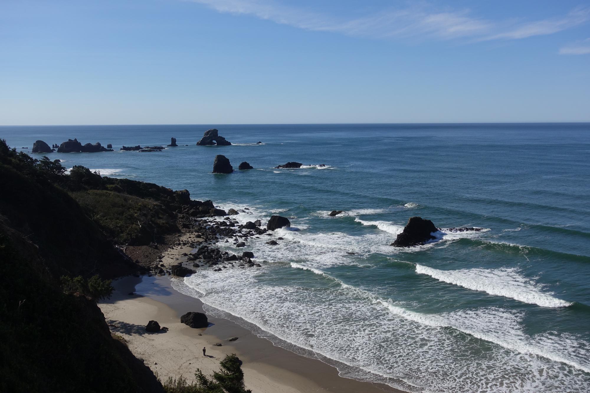 Wir fahren in den Ecola State Park bei Cannon Beach. Als wir um 10 Uhr ankommen, können wir den Parkplatz noch auswählen. Wir schnallen Rucksack und Wanderschuhe an und machen uns auf den Weg auf einem wunderschönen Trail zum Indian Beach. Hier hat es viele Surfer und ein paar Hunde, einer sieht aus wie die Bora meiner Grosseltern und ist auch etwa gleich übermütig.