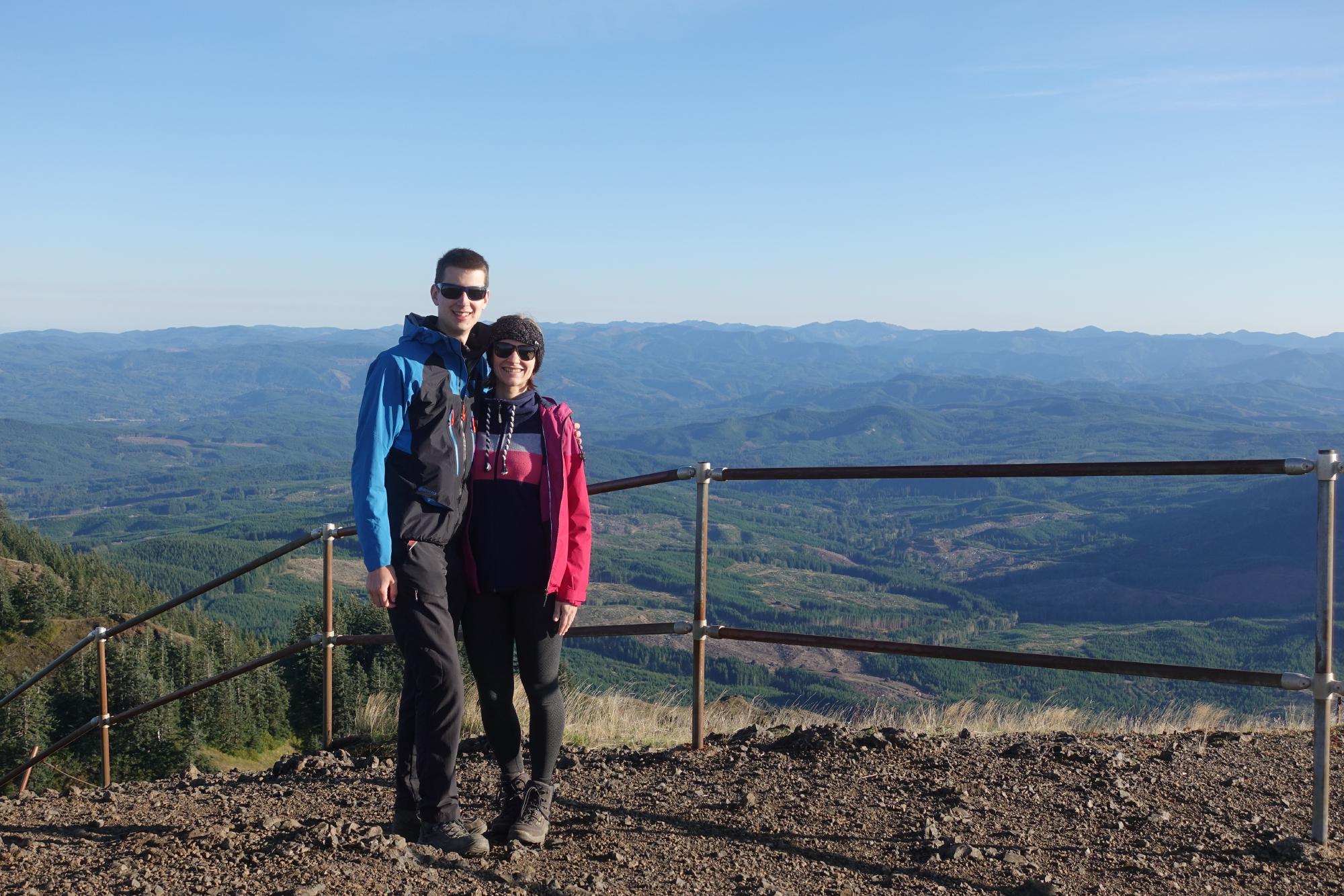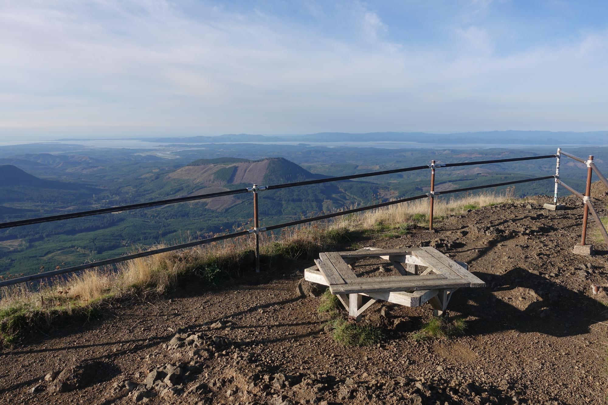 Wir haben 360° Rundumblick auf… Wald? Uns wir nun bewusst, wieso es auf den Autonummern aus Oregon eine Tanne hat; es hat hier wirklich ganz furchtbar viele Bäume! Hinter all dem Wald sind die nahen Vulkane, das Meer und der Fluss Columbia zu sehen, den wir heute Morgen überquert haben.