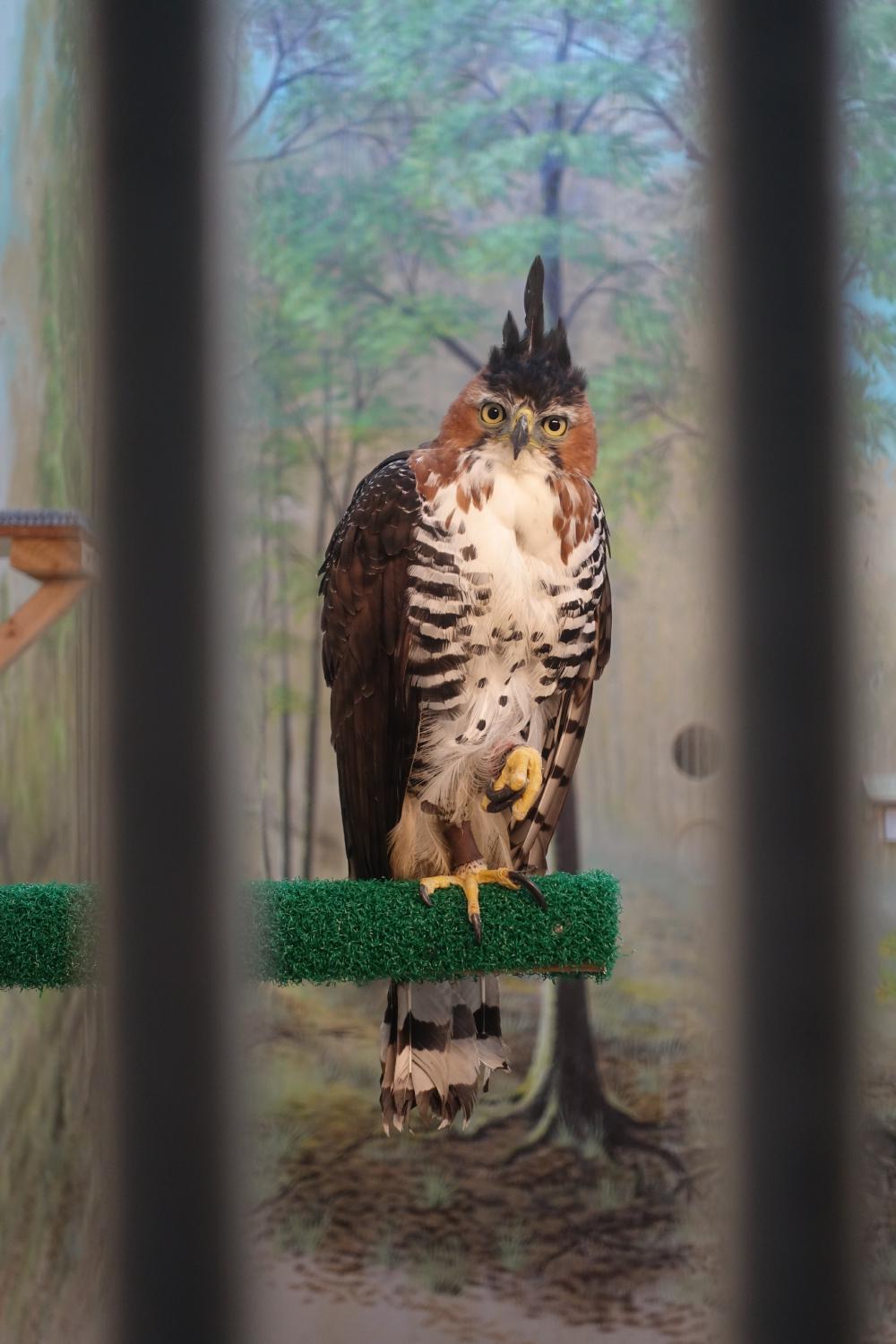 Nach dem Spaziergang haben sich die 300 Besucher etwas verteilt und wir sehen uns in Ruhe die Volièren und Infotafeln an; die Vögel haben für unseren Geschmack nicht gerade üppig Platz, aber wenn sie jeden Tag in der Show etas herumfliegen dürfen, dann ist das vermutlich in Ordnung. Schilder erklären uns auch, dass diese paar Vögel nicht mehr lebensfähig wären in der Wildnis und nun als Botschafter fungieren, damit wir Menschen sie besser verstehen lernen und so ihre Freunde werden statt ihre Feinde… alles sehr amerikanisch.