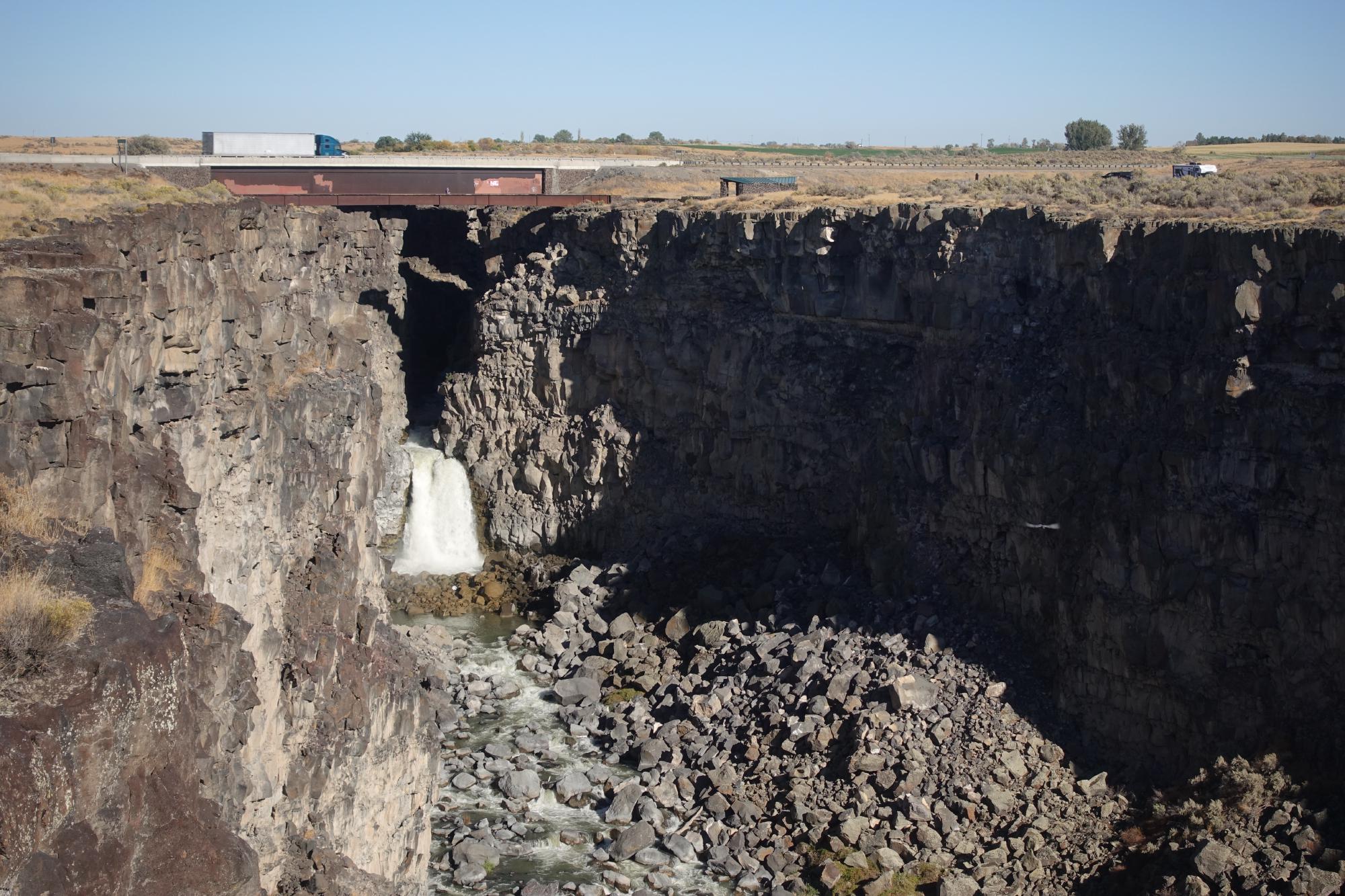 Schliesslich stellen wir das Navi ein und fahren auf die Autobahn. Unser Vehikel schafft tatsächlich 80 Meilen pro Stunde, dröhnt dabei aber sehr laut, so dass wir das Hörbuch sehr laut einstellen müssen, damit wir der Geschichte noch folgen können. Wir fahren über die Ebene und halten kurz bei der Malad Gorge an, eine der Schluchten, die die Flüsse hier in die Erde gegraben haben.