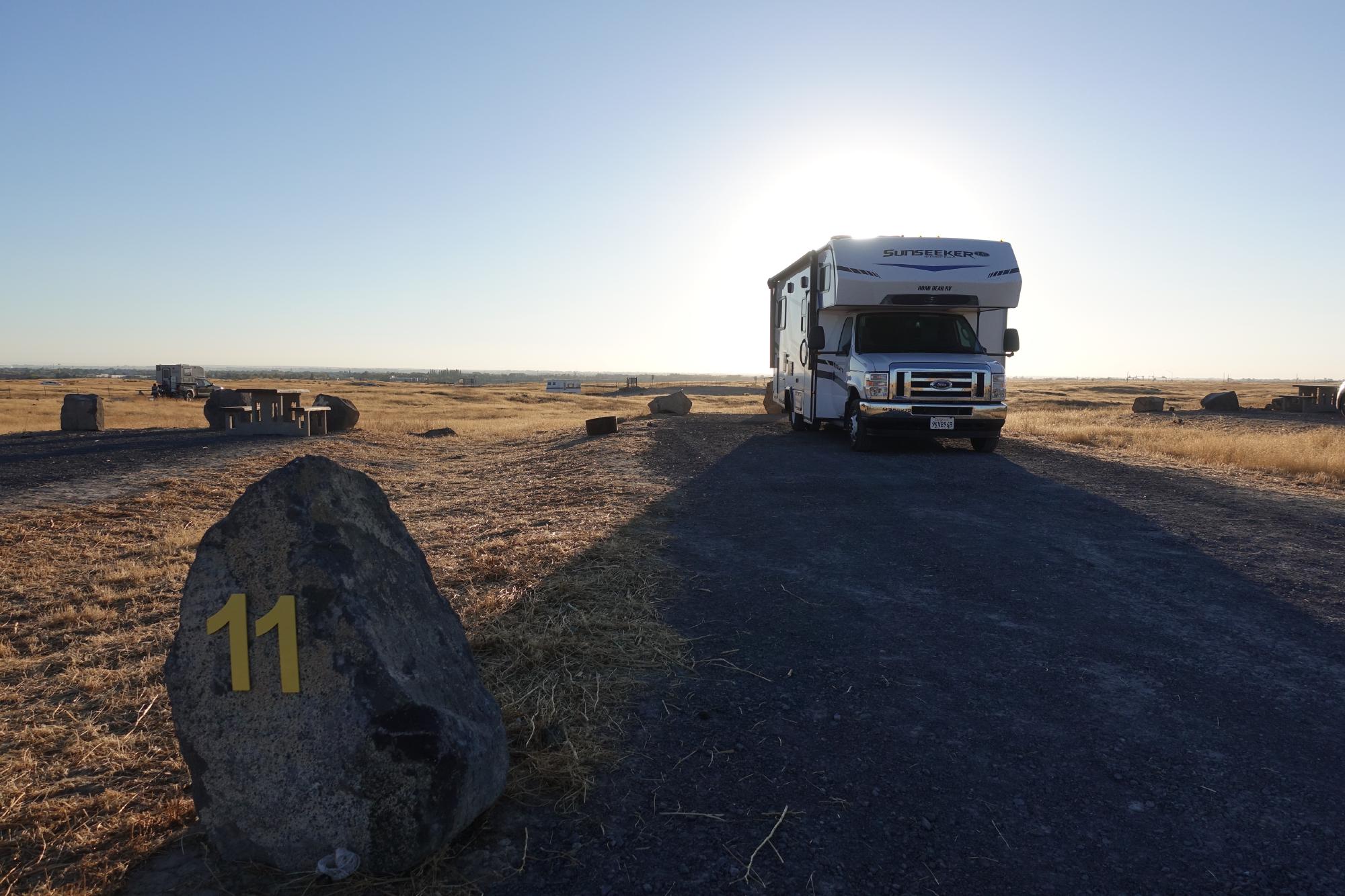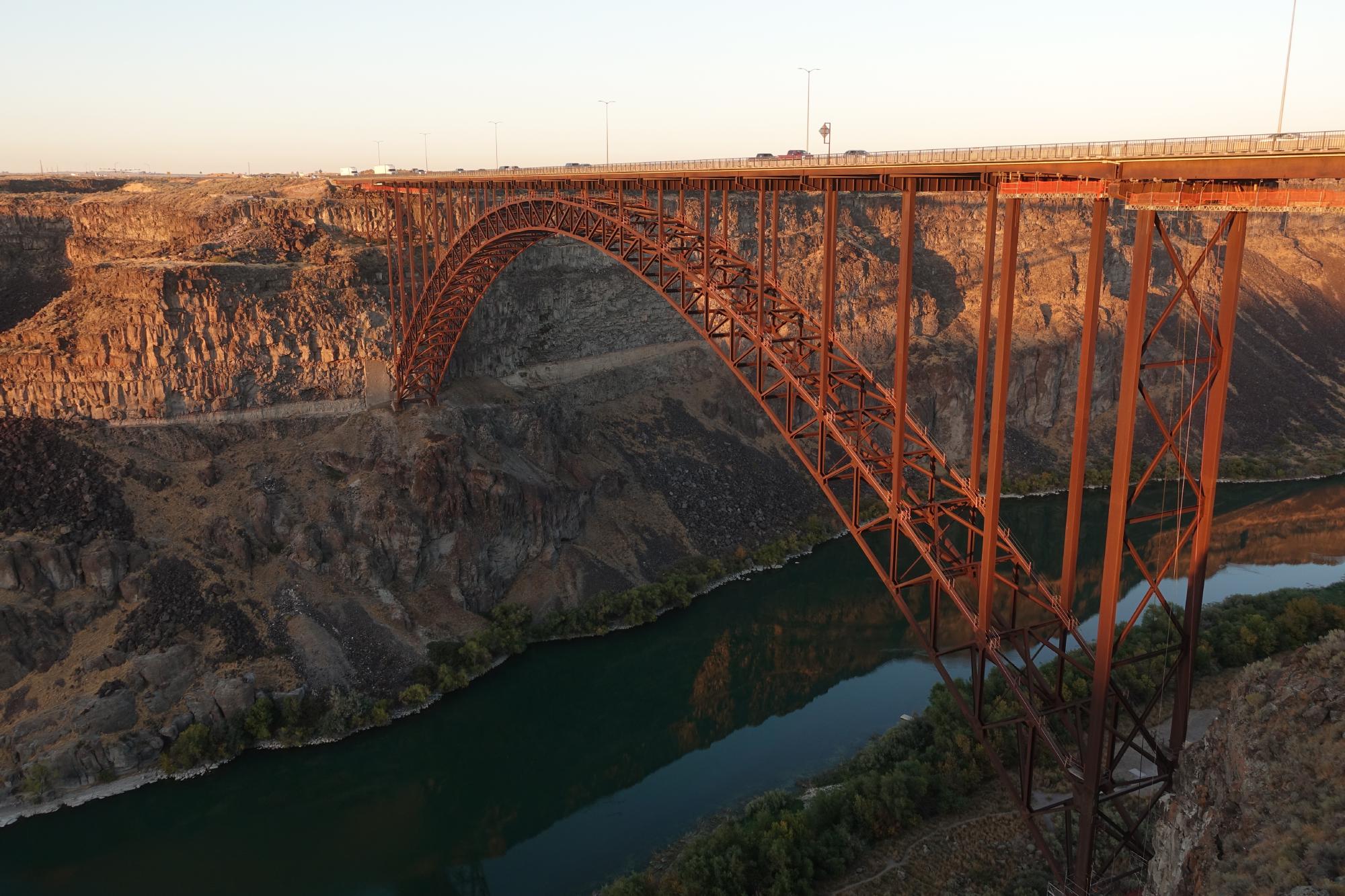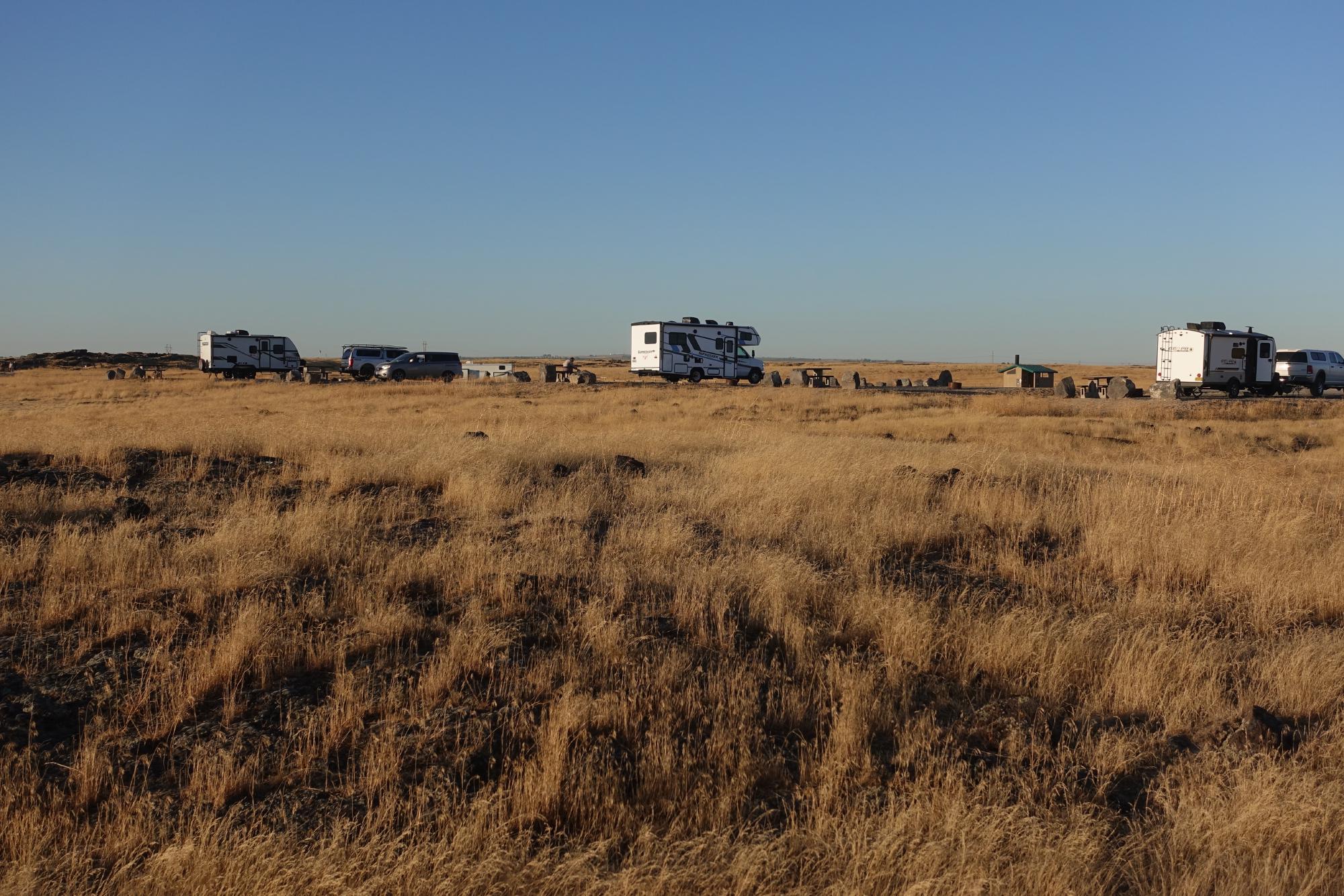 Kurz vor der nächsten Spalte, bei Twin Falls, biegen wir auf den herausgesuchten Stellplatz ab. Es hat tatsächlich noch Platz und wir stellen uns hier für die Nacht auf. Leicht erhöht, mit Blick über die Steppe und auf Twin Falls.