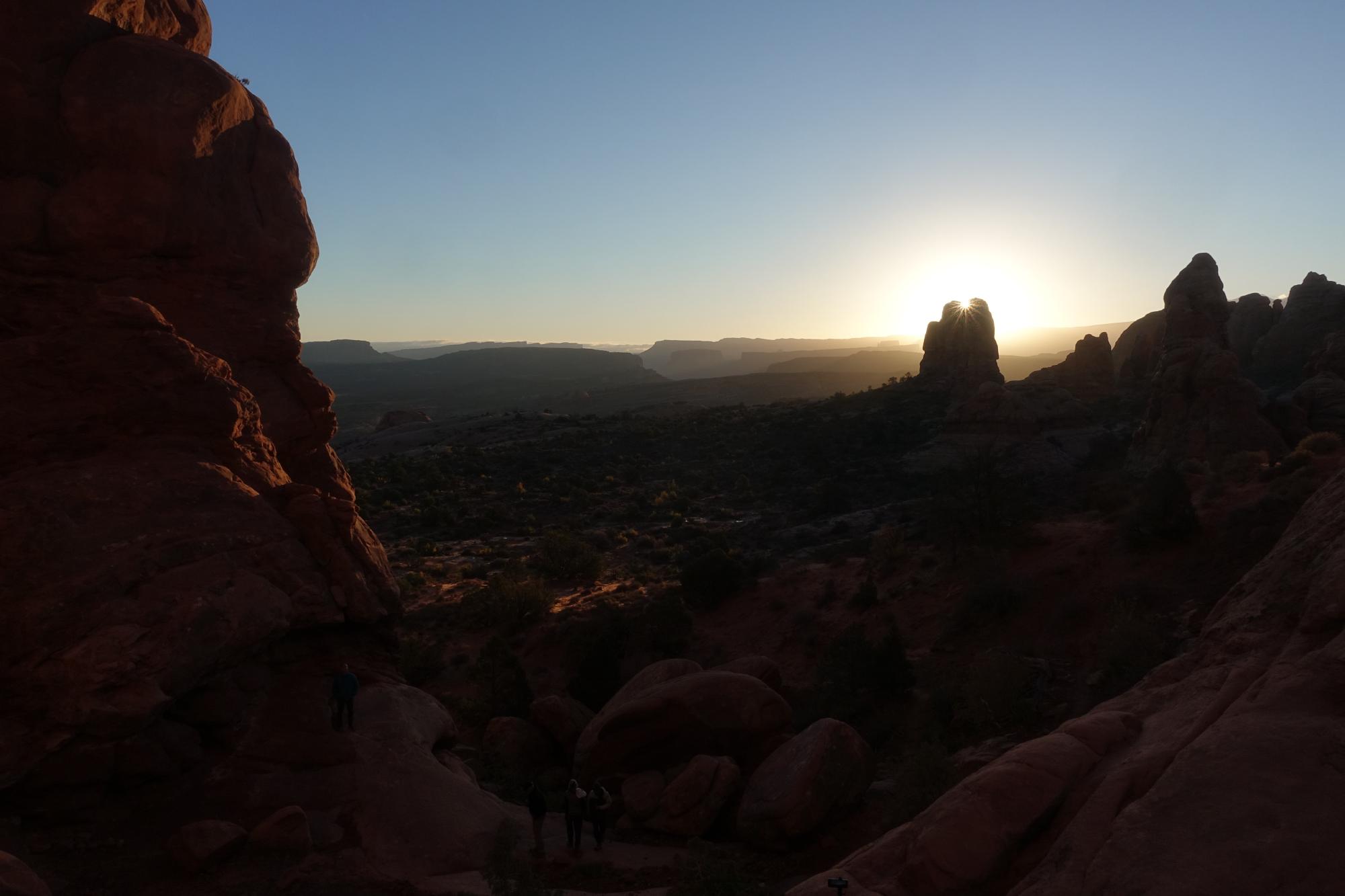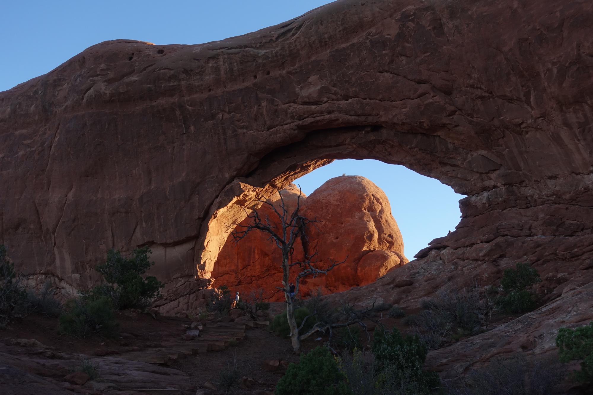 Wir fahren mal wieder in Richtung Moab und biegen auf die Zufahrt zum Nationalpark ein; ein ganz anderes Bild als gestern! Wir können direkt zum Gate durchfahren, werden mit einem Plan des Parks ausgestattet und sind um halb sieben schon durch die Kontrolle; geschafft! Wir fahren zur Gesteinsformation, die “The Windows” genannt wird, es hat hier gleich vier der bekannten Gesteinsbögen. Als wir auf dem Parkplatz ankommen, beginnt es langsam zu dämmern und wir packen rasch einen Rucksack mit unserem Frühstück, um uns die Zeit bis zum Sonnenaufgang zu versüssen.