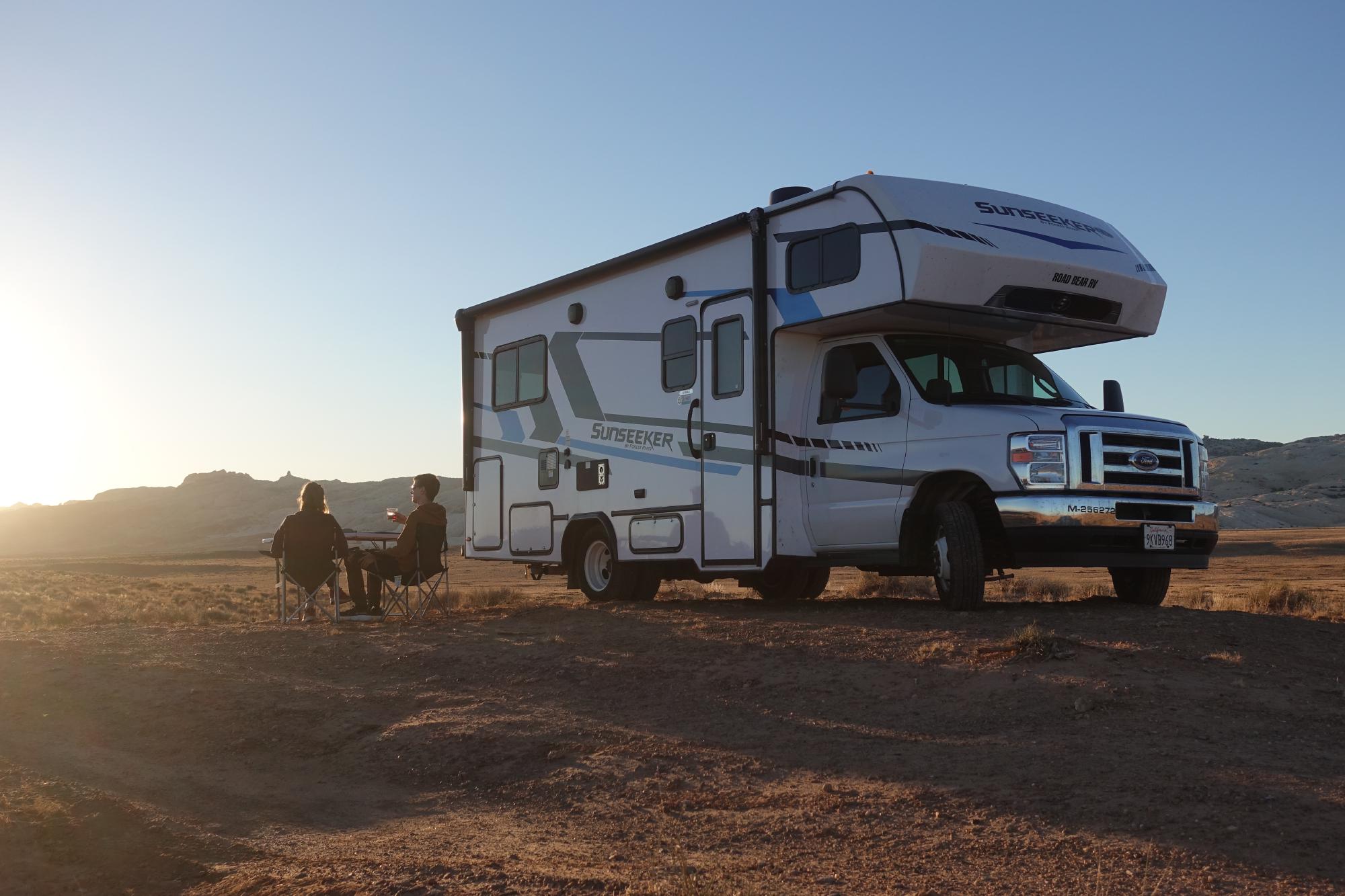 Nach dem Marsch haben wir Hunger, also halten wir an einem schönen Plätzchen an und kochen Gnocchi mit Birnen-Gorgonzolasauce. Wir beschliessen, dass das genug Bögen waren für heute und machen uns bereit für die Weiterreise. Wir wenden Moab den Rücken zu, zu Marcos grosser Erleichterung, und fahren am Nachmittag noch ca. zwei Stunden bis in die Nähe des Goblin Valley State Parks. Wieder gehts auf einen Kiesweg, wir fahren auf eine Anhöhe, auf der schon einige Camper herumstehen. Wir finden auch noch ein freies Plätzchen und setzen uns voller Freude mit den Campingstühlen in die Abendsonne, es ist noch schön warm!