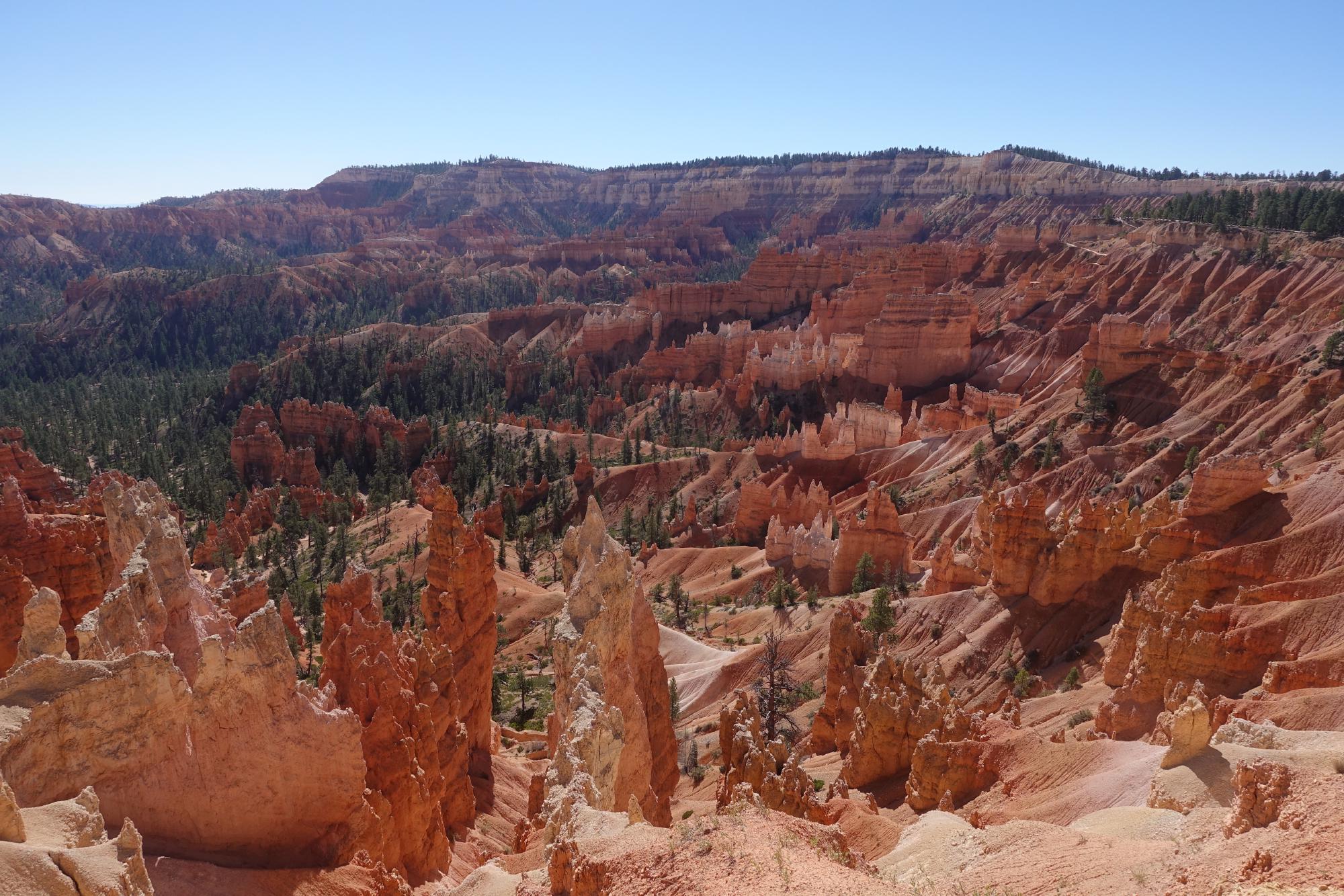 Wir schlendern vorbei an vollen Parkplätzen durch den Nadelwald, nicht sicher, was uns da erwartet. Und plötzlich sind wir vorne angekommen und sehen in den Canyon herab. Hier hat es keine Absperrung, es geht einfach zünftig das Loch herunter und ein paar Schilder warnen, man solle sich nicht zu nahe an den Abgrund begeben.