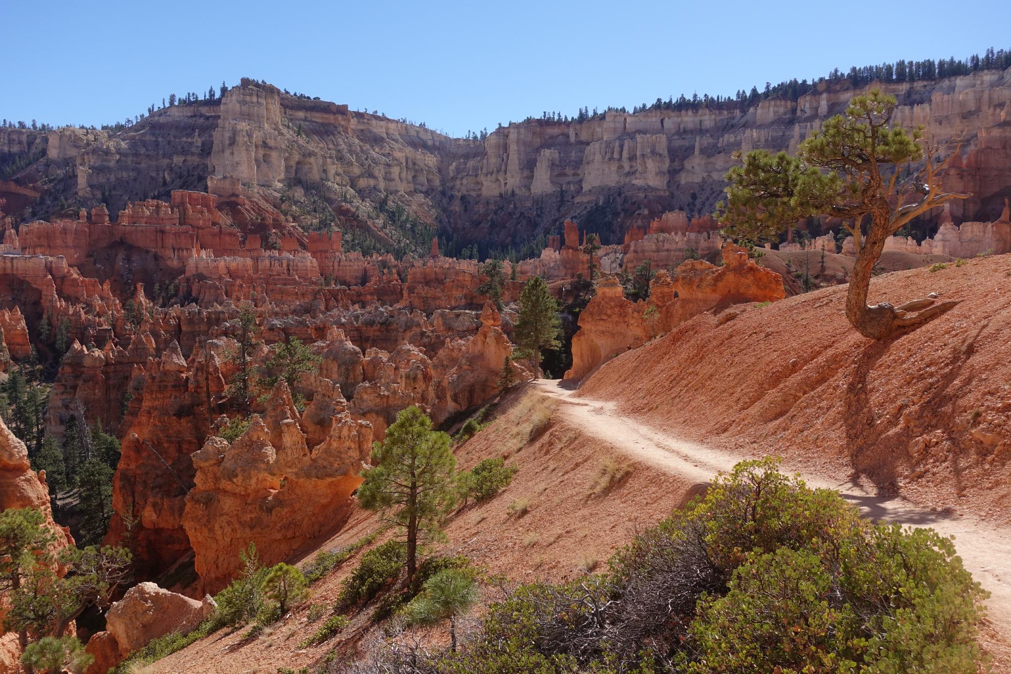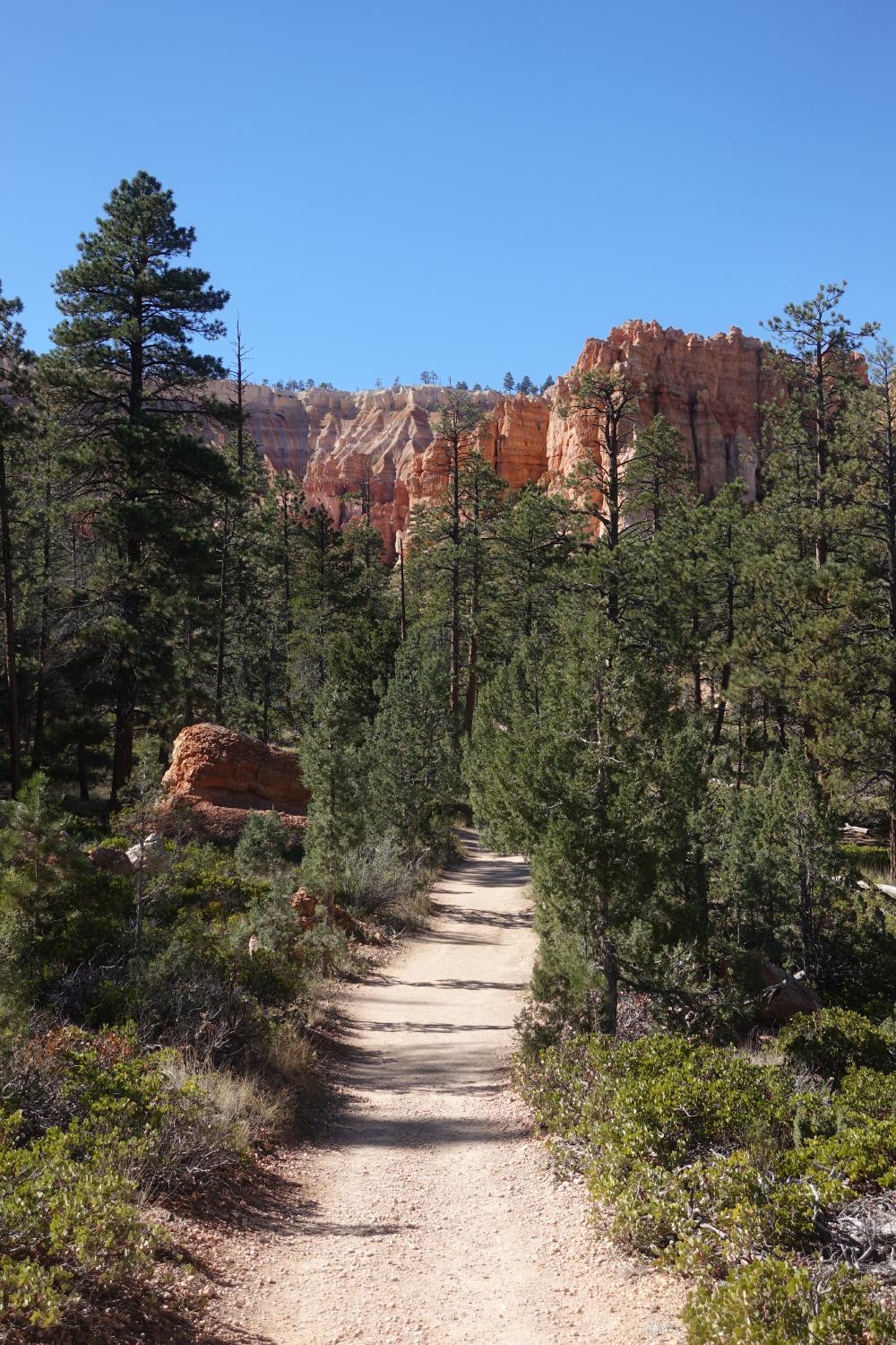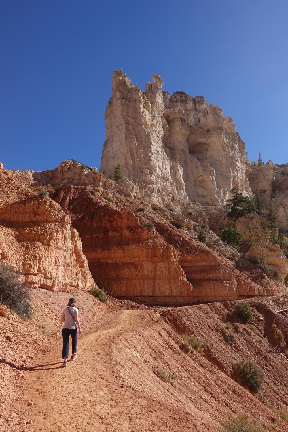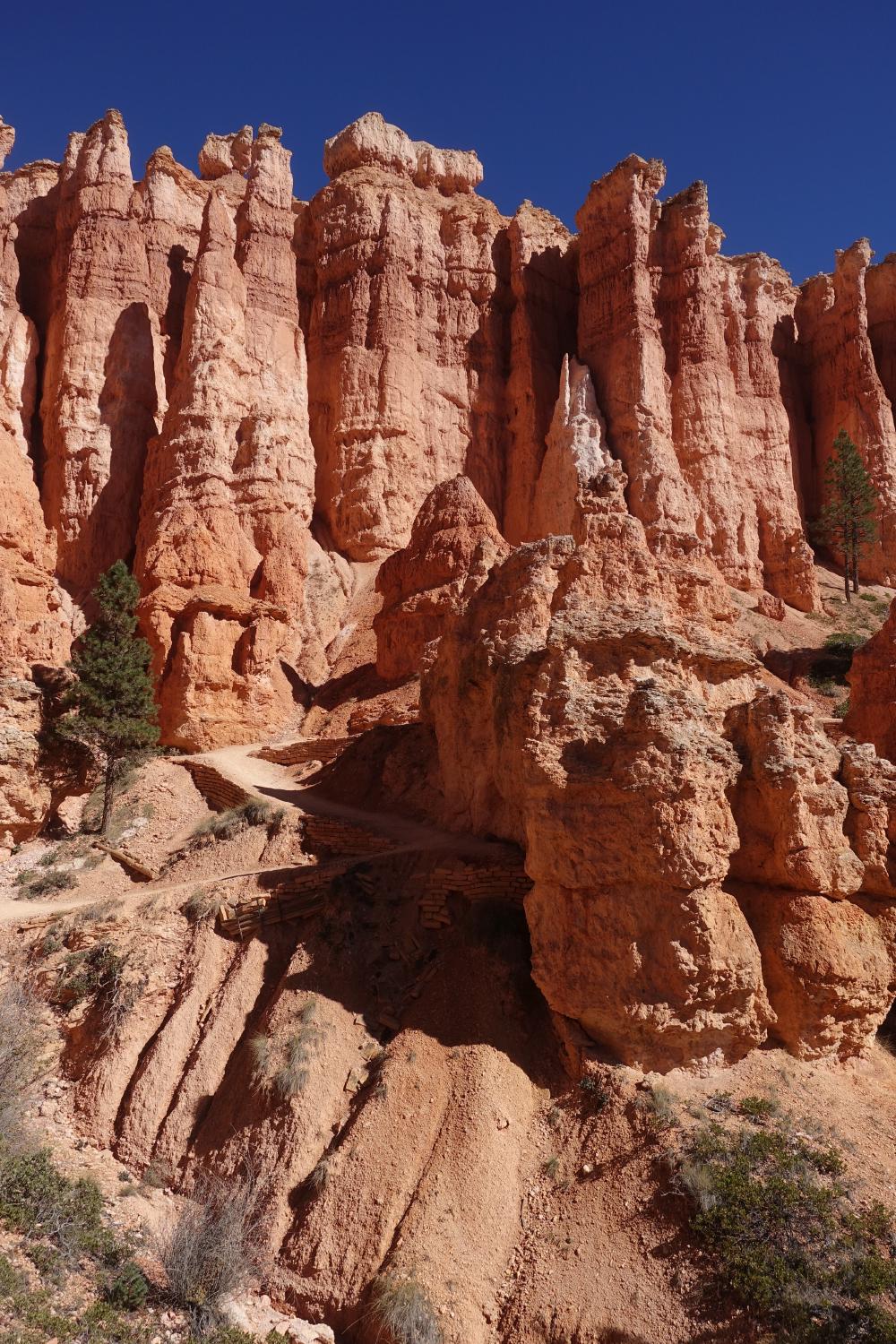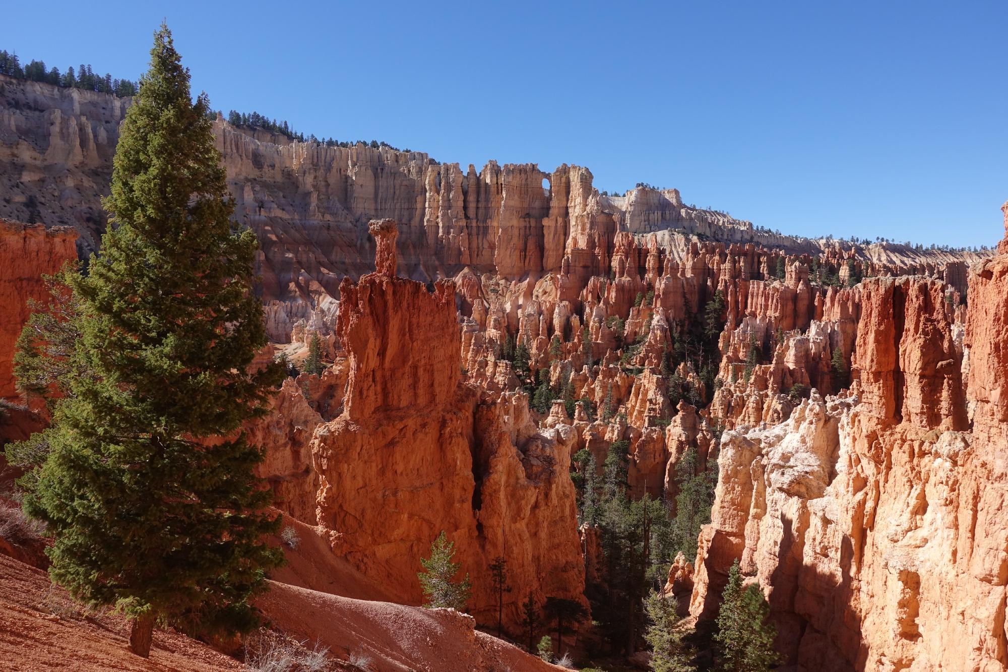 Wir befinden uns im Teil des Nationalparks, der Amphitheater genannt wird. Man kann hier den Rim Trail nehmen und alles der Abrisskante entlang spazieren, oder, und das machen wir, in den Canyon hinunter stechen und zwischen diesen imposanten Türmchen (“Hoodoos”), unter Gesteinsbögen hindurch und weiter unten durch lichte Wälder wandern. Was eigentlich als kleine Runde von 2 km begonnen hat, endet in, wer hätte es gedacht, einer nachmittagsfüllenden Wanderung, an deren Ende wir auf der anderen Seite des Canyons wieder oben ankommen und dann doch noch den Rimtrail zurück zum Camper nehmen. Wie das so ist, haben wir bei jedem Abzweiger noch eine kleine Runde angehängt, weil es so schön war.